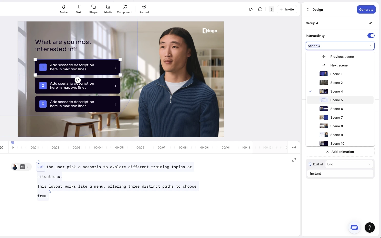 You might choose to create an interactive training video from scratch in Synthesia when the learning flow, branching logic, or on-screen interactions donβt fit a fixed template.