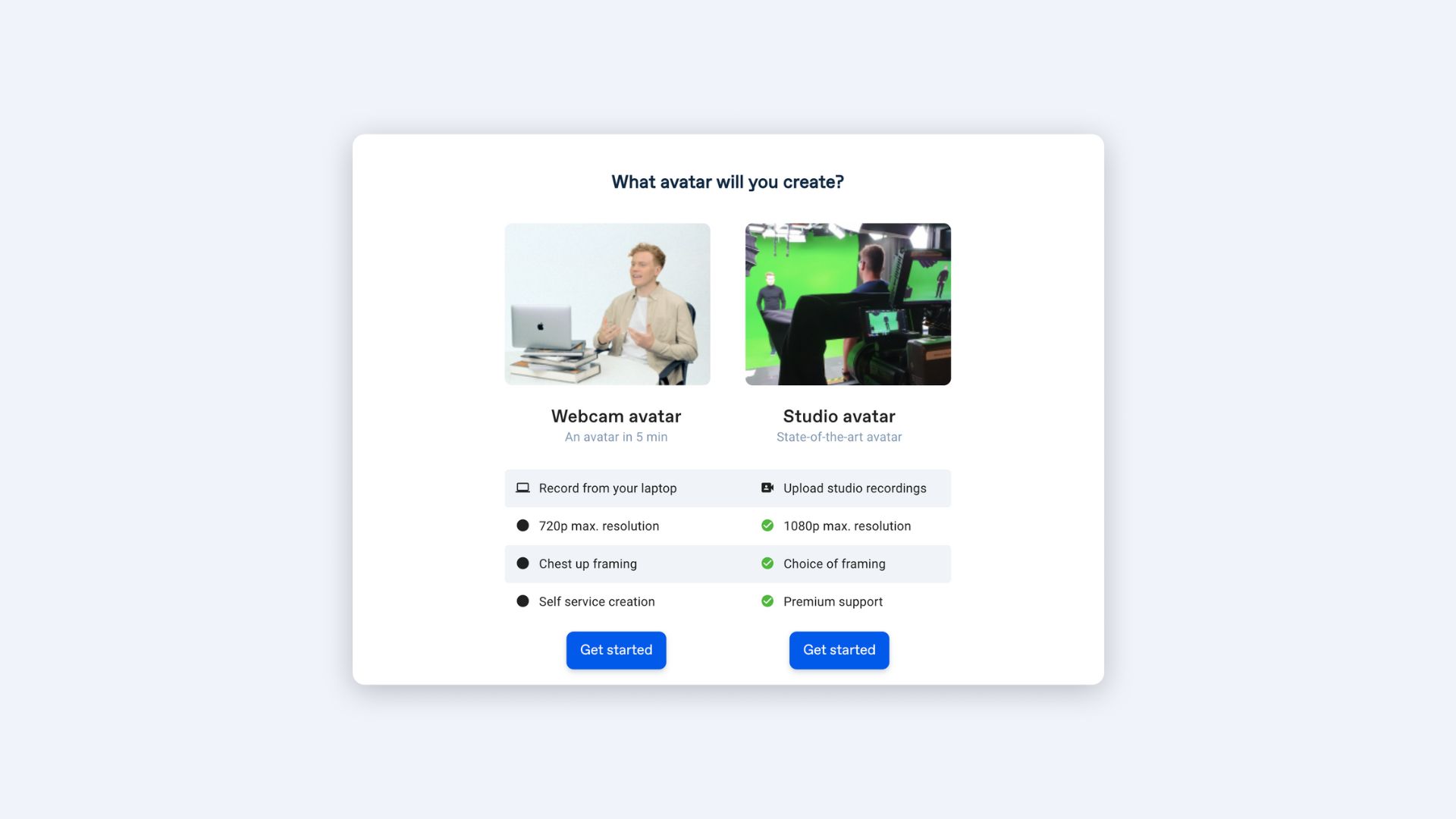 Custom Avatare: Für executive Kommunikationsmaßnahmen oder Marken-Konsistenz erstelle einen Custom Avatar von dir selbst oder deinem Sprecher/in. Gehe zu 'Avatare' → 'Erstelle deinen eigenen Avatar'. Wähle zwischen einem 5-minütigen Web-Avatar oder einem benutzerdefinierten Avatar in Studioqualität basierend auf deinen Bedürfnissen und deinem Budget.