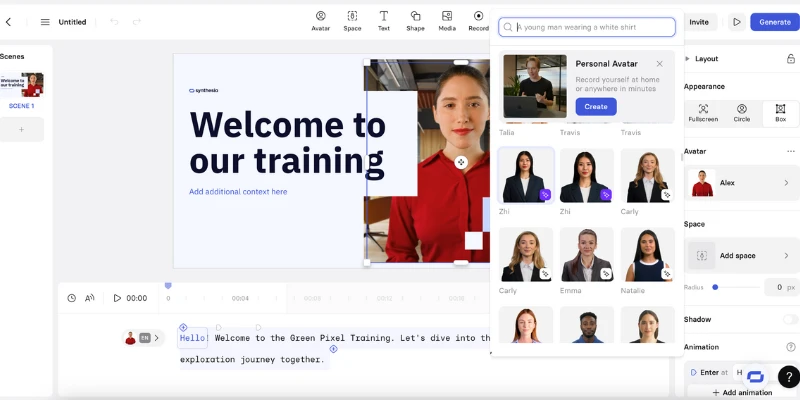 Se te mostrará una variedad de más de 240 avatares con IA para elegir. Intenta elegir el que mejor se adapte al tema de tu video de formación.