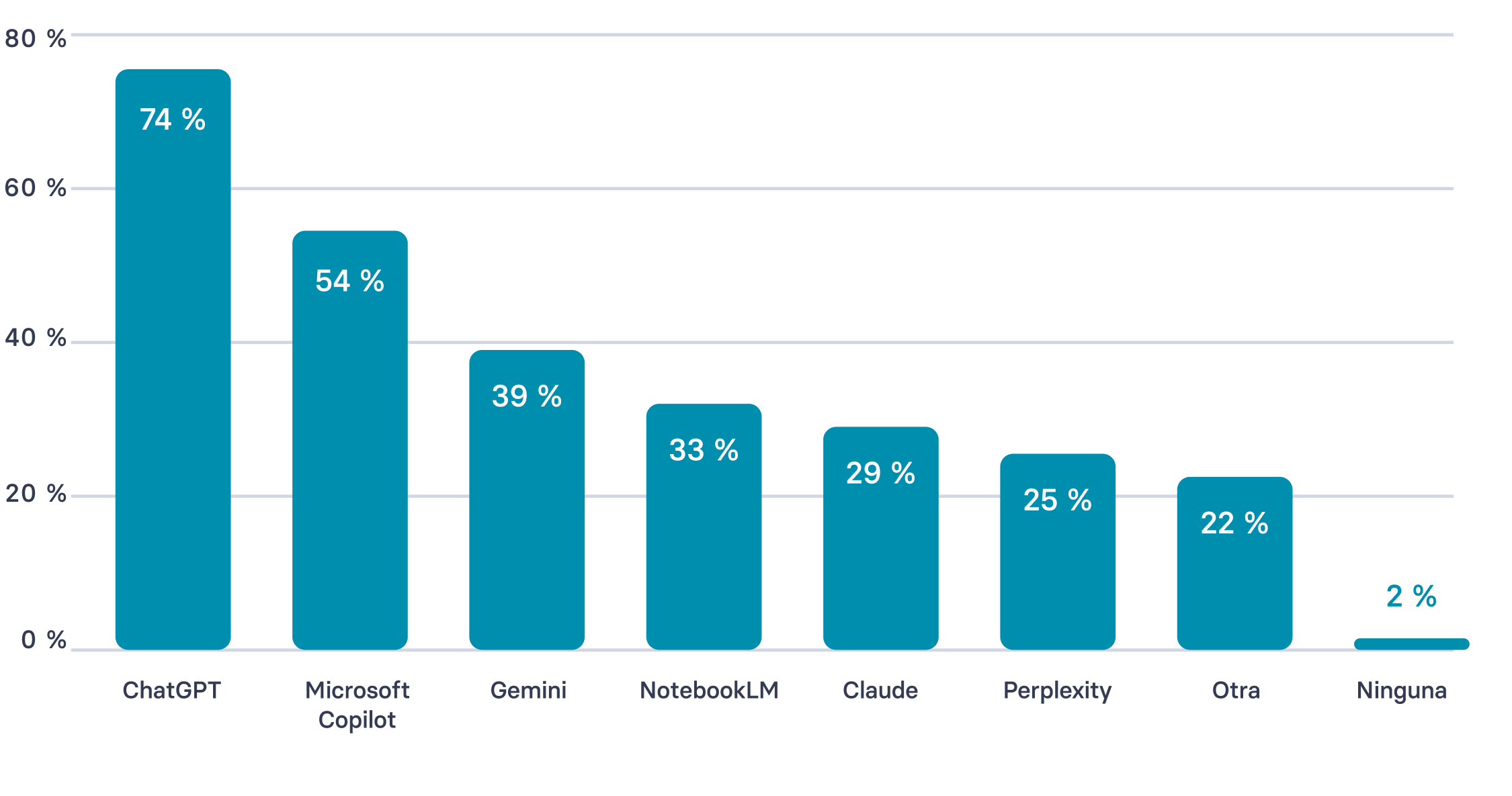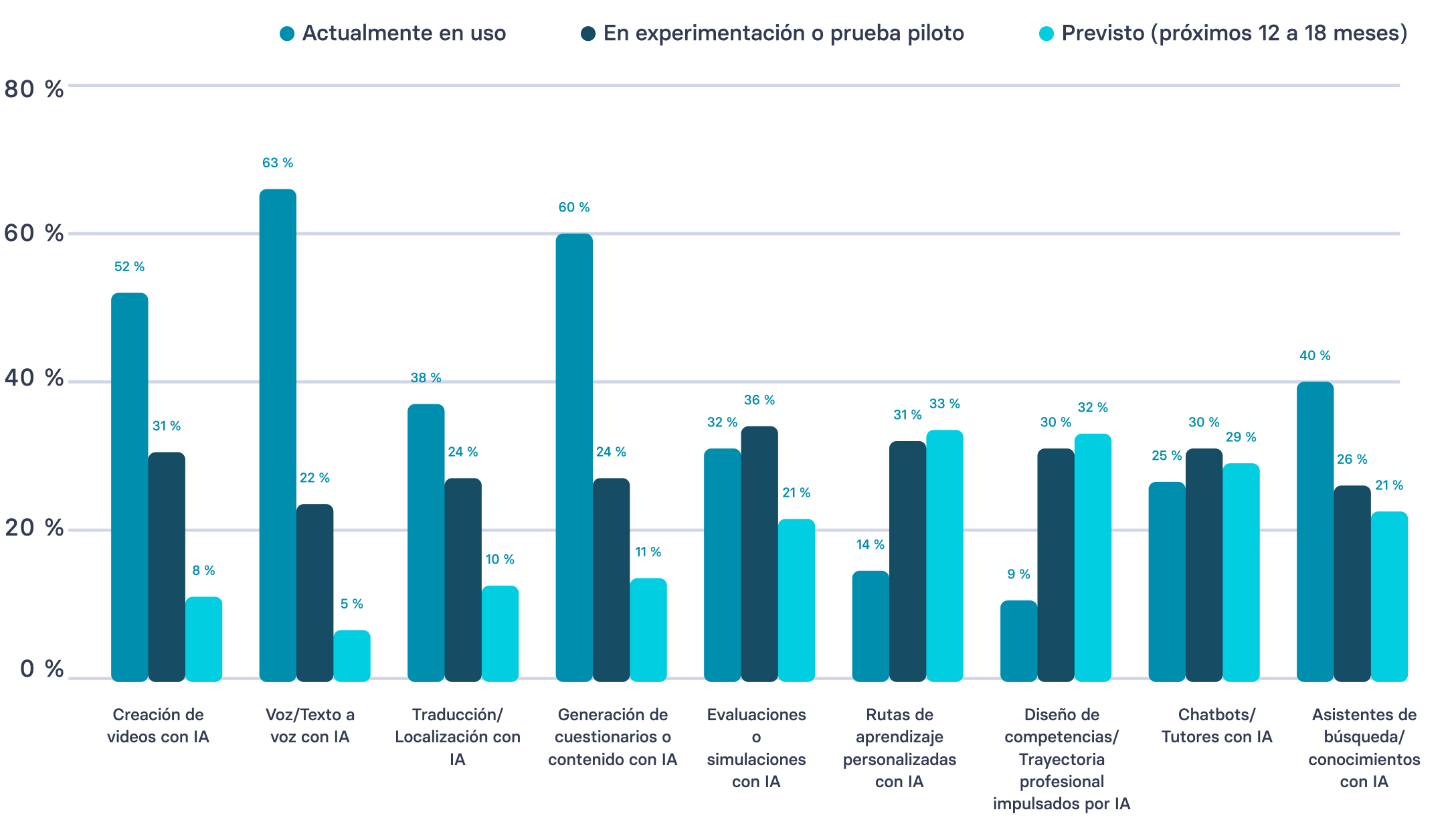 El mayor uso se da en tareas de producción básicas como la conversión de texto a voz (63 %), la generación de cuestionarios (60 %), la creación de videos (52 %) y la traducción/localización (38 %).