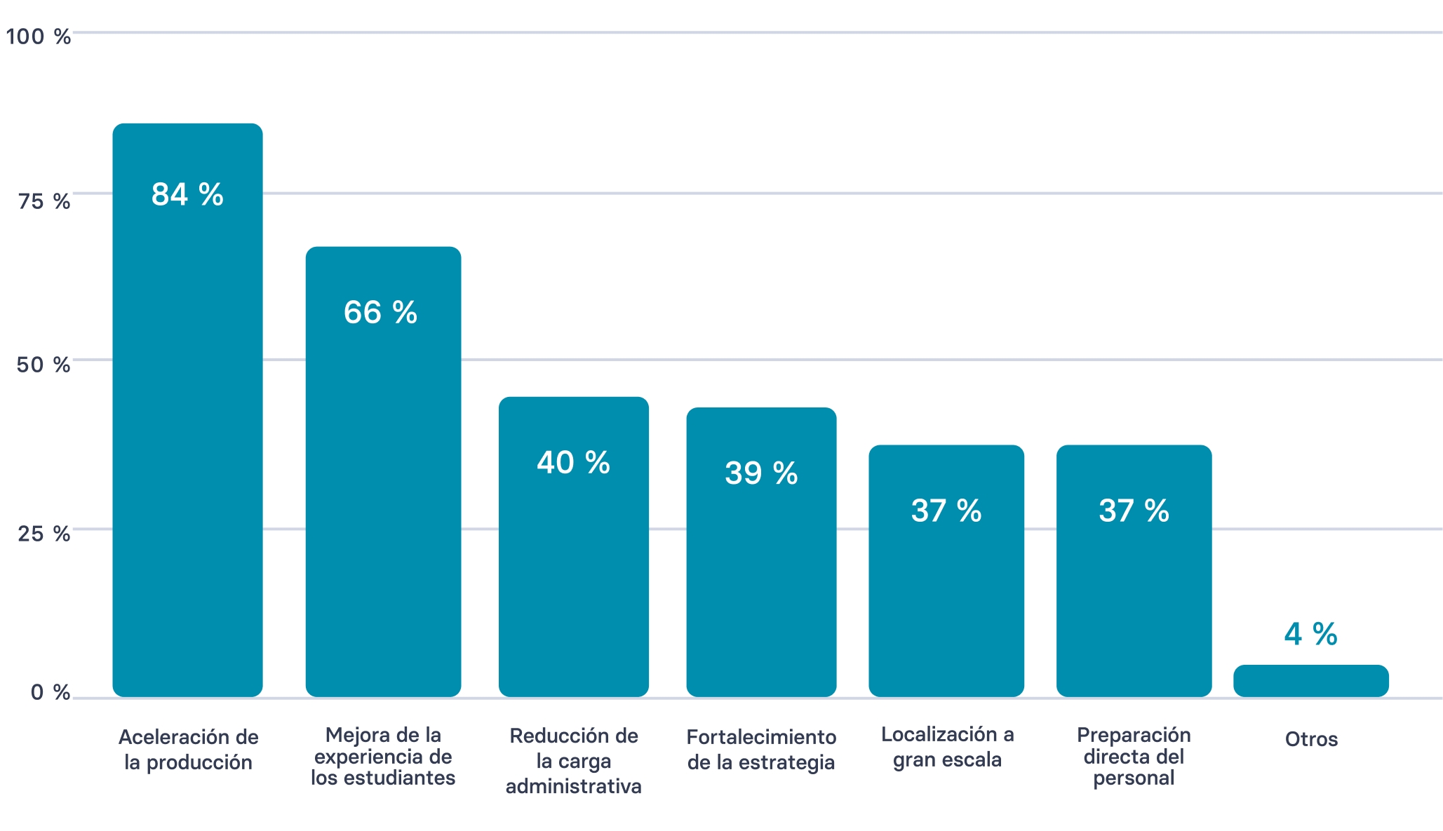 También aumentan las expectativas de ampliar el alcance interno (65 %), mejorar la participación y la satisfacción de los usuarios (56 %), tener un impacto empresarial más claro (55 %) y facilitar la localización (54 %), lo que indica un paso hacia un aprendizaje escalable y personalizado con un costo operativo más bajo.