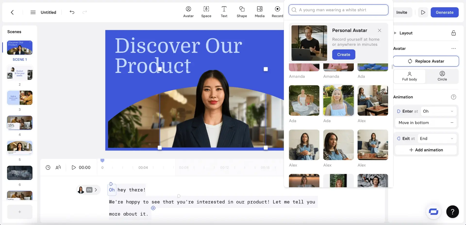 Les fonctionnalités d'animation de personnages de Vyond sont uniques. La plateforme vous permet de créer des personnages personnalisés, en choisissant leur apparence, leurs tenues et même leurs mouvements. J'ai créé des scénarios animés pour un module de formation au leadership où les personnages étaient confrontés à des problématiques professionnelles (donner un feedback, résoudre des conflits, etc.). La possibilité de synchroniser les mouvements des lèvres des personnages avec les voix off donnaient aux vidéos une touche professionnelle. Mais si les animations sont très efficaces, la création de personnages uniques ou d'animations très détaillées peut prendre beaucoup de temps.