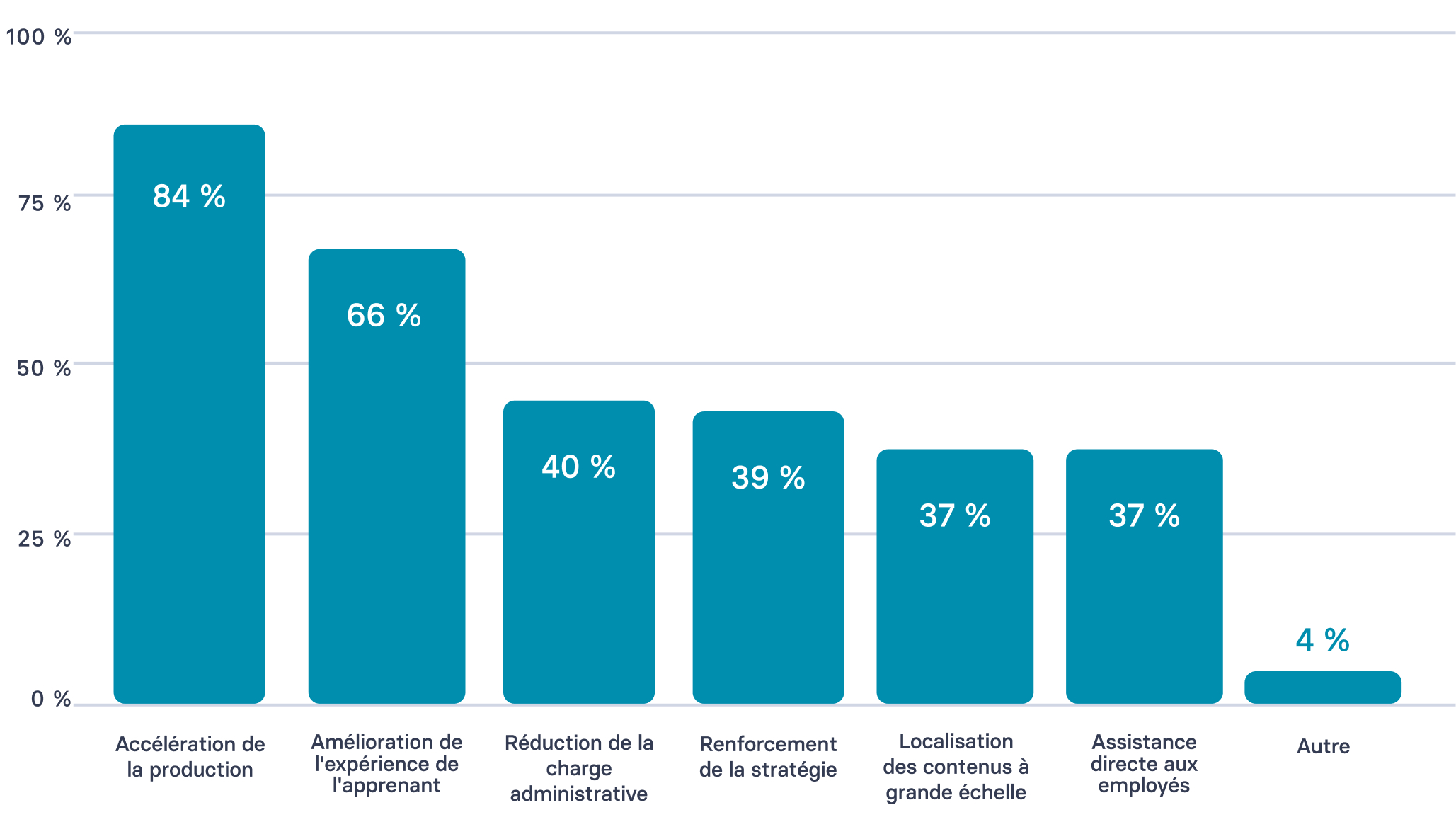 Les équipes prévoient également une plus grande accessibilité en interne (65 %), une amélioration de l'engagement et de la satisfaction des apprenants (56 %), un impact commercial plus net (55 %) et une localisation facilitée (54 %), ce qui témoigne d’une tendance vers un apprentissage évolutif, personnalisé et à moindre coût opérationnel.