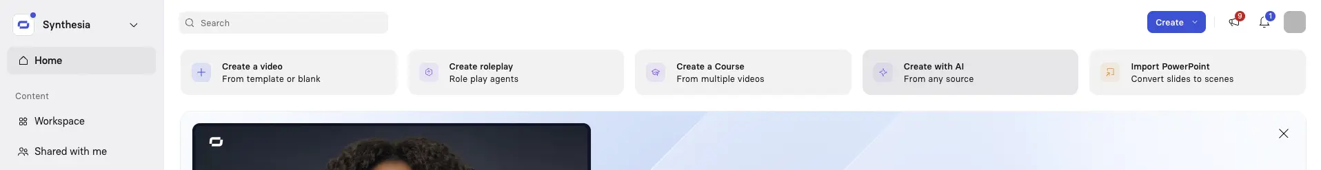Click 'Create with AI' at the top of the Synthesia homepage.