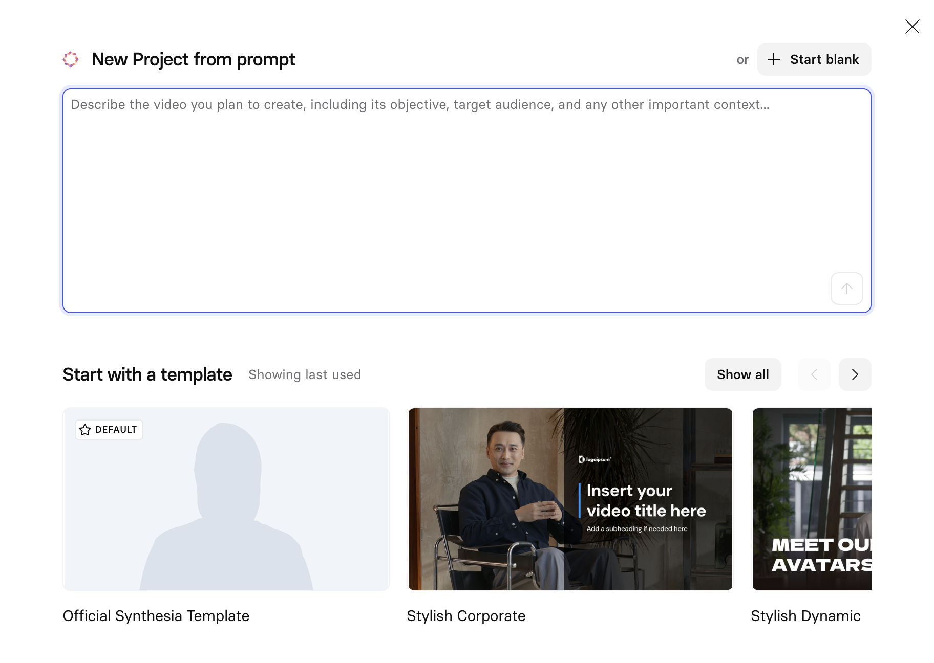Sign into Synthesia and you'll see two options: use a template or build from scratch. Templates are perfect when you're starting out—they've already solved the design decisions for you. Need more scenes? Click the + button on the right side of the video canvas to access pre-designed scenes that match your template's style.