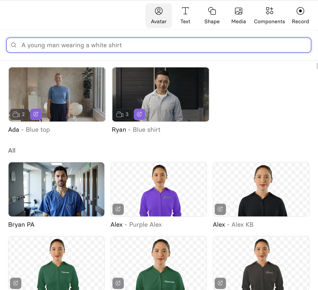 So let's assume you decided to create your own video from scratch. Click the Avatar icon above the canvas to browse options. Avatars come in a rage of ethnicities, contexts and framings, while our latest generation of Express-2 avatars offer full-body visibility with expressive body language, multiple camera angles you can switch between, and improved lip-sync.