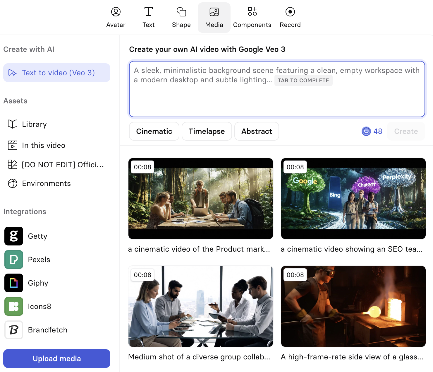 This is the part where you fine-tune your video. Click Media at the top of the canvas to access images, videos, and icons (you can even generate your own visuals with AI). But don't just throw in random visuals. Follow the one-focal-point rule: each scene should direct attention to one key element.
