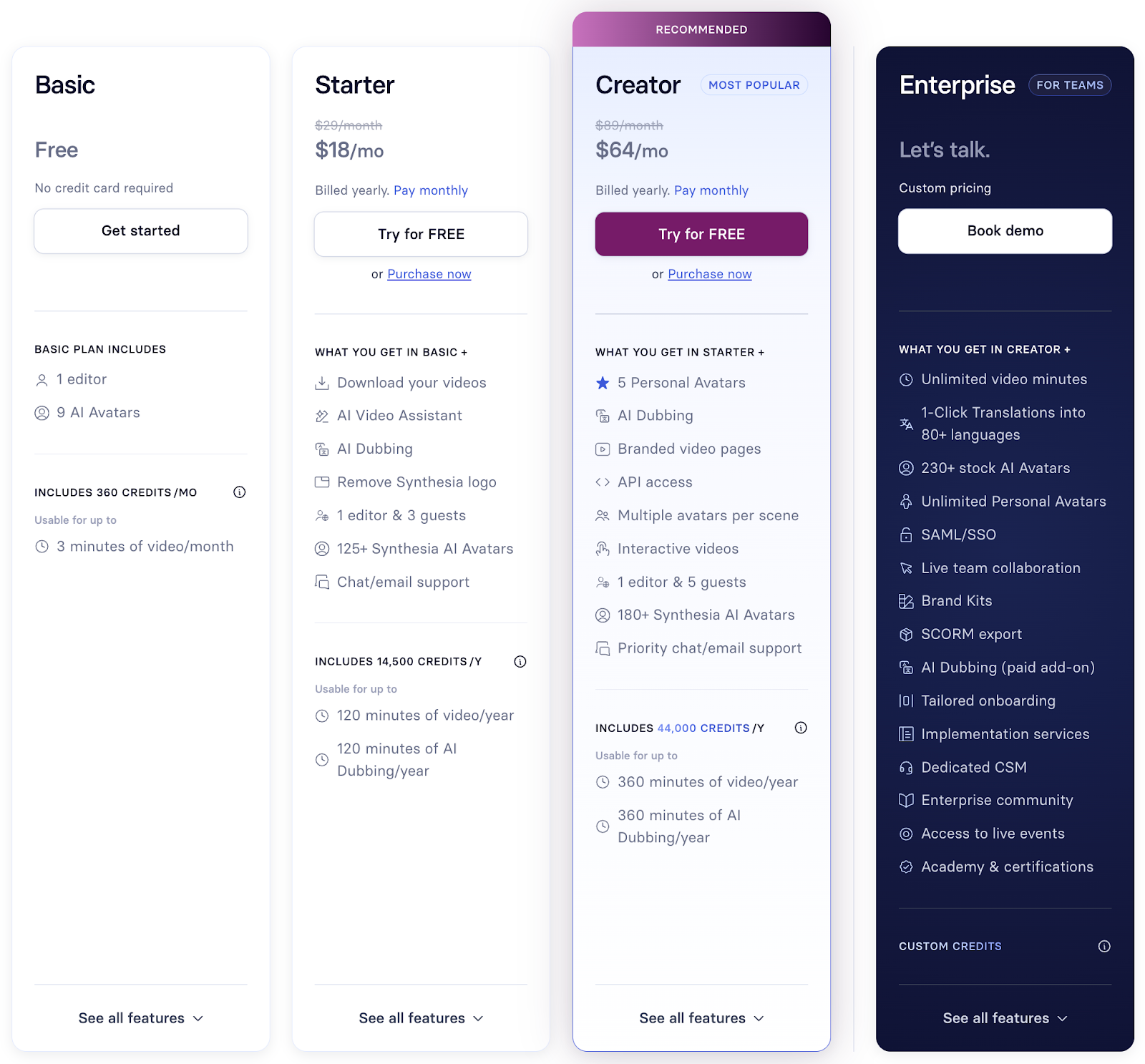 For Synthesia today, plans include Basic, which is free and has limited features, Starter and Creator, which cost $18/month and $64/month, respectively, and have many more features, and Enterprise, which has custom pricing and complete feature access.