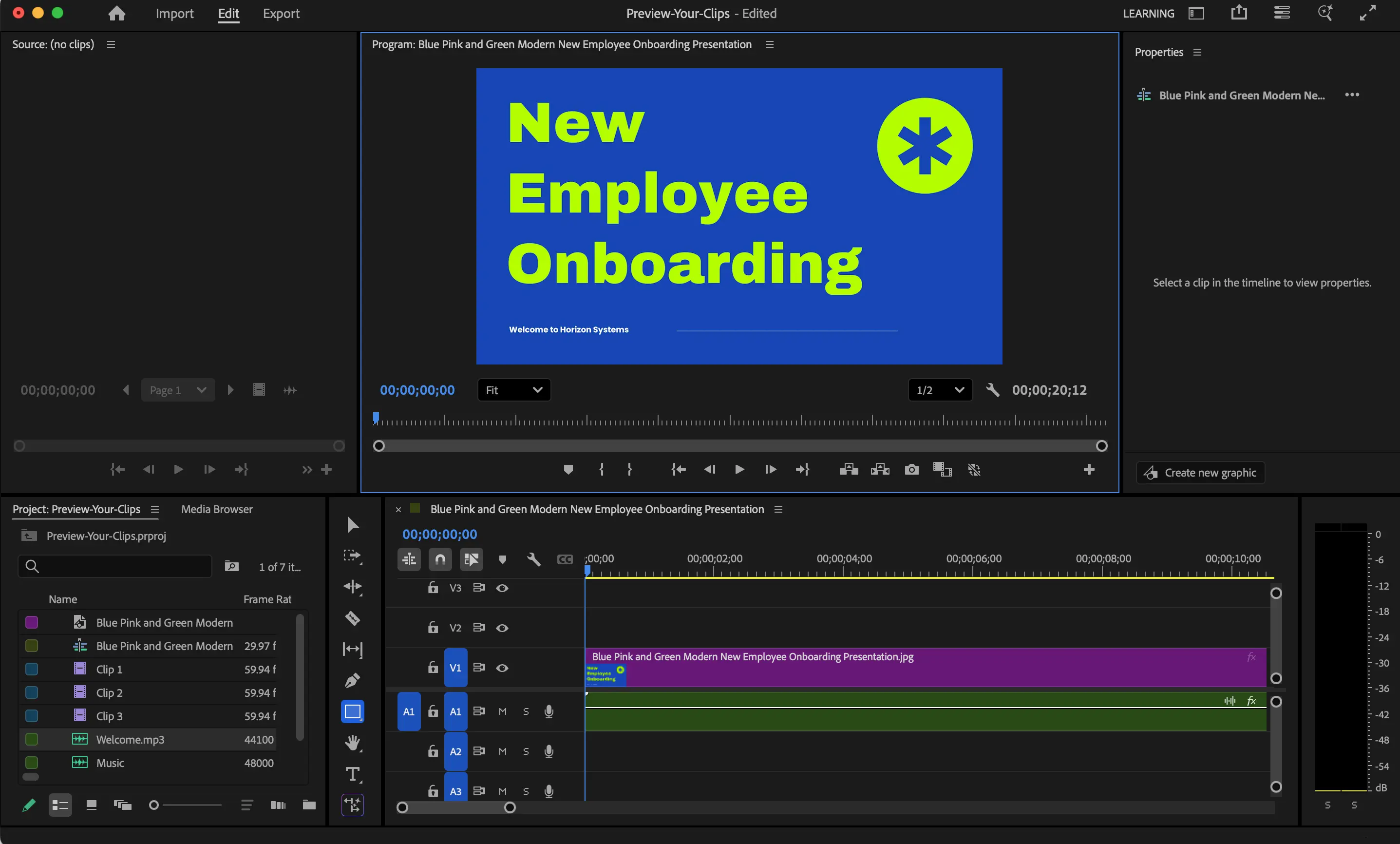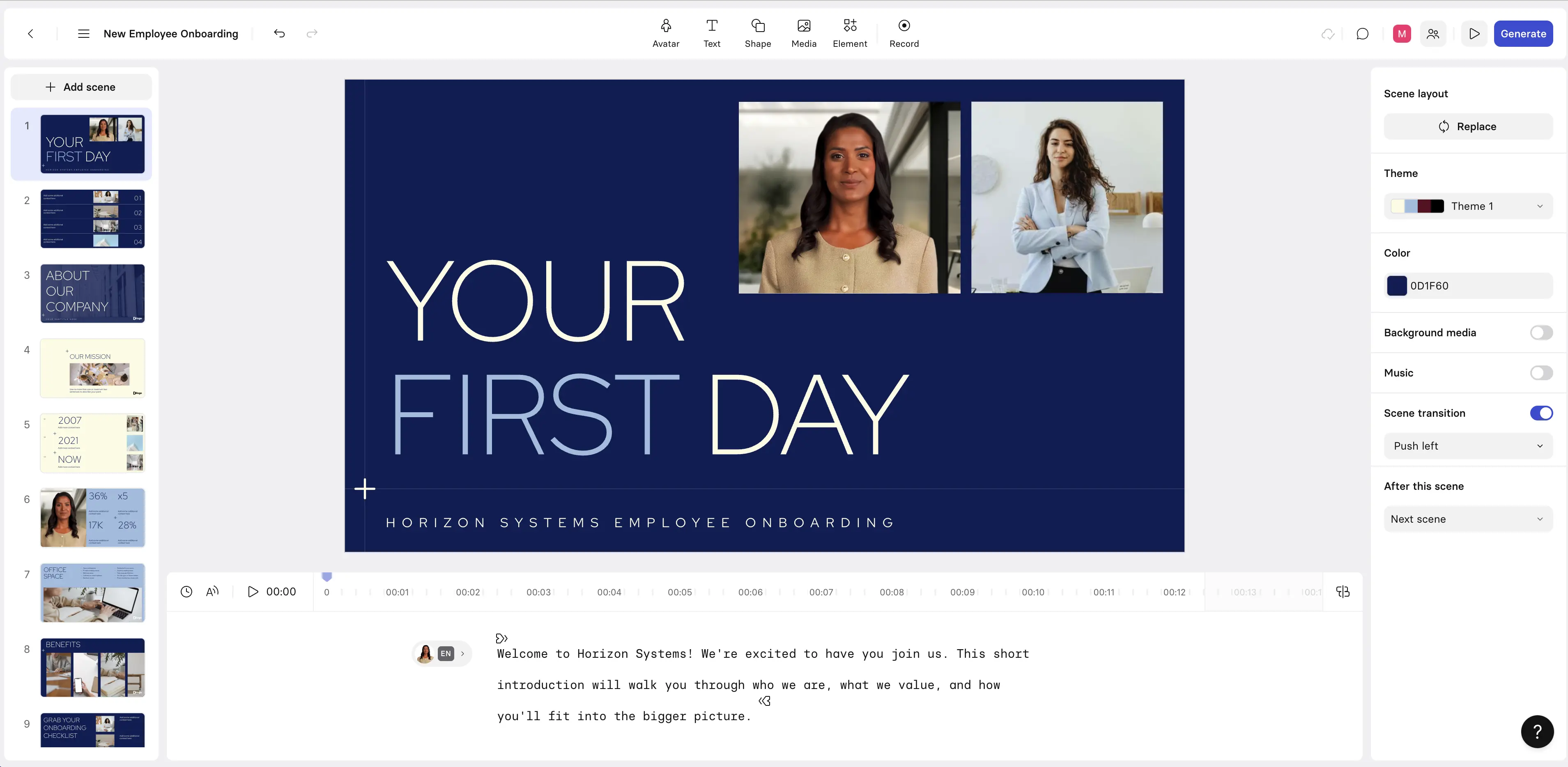 I tried to create the same onboarding video that introduces employees to the fictional “Horizon Systems” and covers mission, values, role expectations, and first-week guidance.